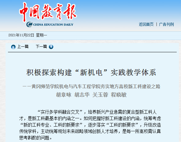 11月22日,《中国教育报》第08版“高校新风”以《积极探索构建“新机电”实践教学体系》为题,分别从“建立特色新机电专业方向集群”、“搭建动态可重构模块化课程体系”、“形成三维立体创新教学模型结构”三个方面,报道了公司机电与汽车工程公司新工科建设的有关探索,以及“新机电”实践教学体系在提升教学质量工程、推动区域经济发展、培育本科人才质量、推广与辐射成果应用上的成绩和经验做法。