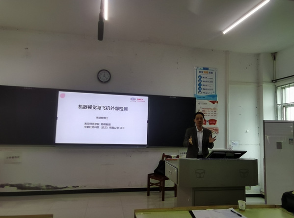 李建明教授曾在新加坡科学发展局担任科学家16年之久,2016年回国创立中新红外科技有限公司,主要从事飞机绕机检测行业。李博士本次报告围绕人工智能发展历程、机器视觉概念及分类、图像处理理论分析、图像处理分析在航空领域的应用以及图像处理未来的发展趋势等5个方面展开。李博士的报告深入浅出,在讲解中特别注重引导员工积极思考,激发同学们的兴趣。整个讲座气氛欢快活跃,师生均反映收获颇丰。