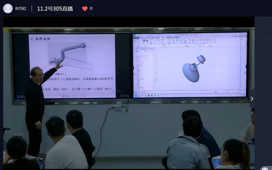 凌老师讲授课程《机械产品造型设计》,以实例分析切入教学主题,对扫描混合特征命令的使用开展形象生动的讲解,教学过程中采用启发式教学方法与员工展开积极互动,引导员工积极主动开展扫描混合特征应用于机械产品造型设计的探索与思考。