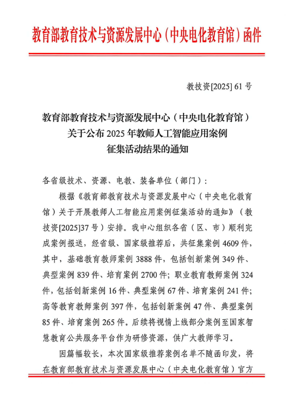 近日,在教育部教育技术与资源发展中心(中央电化教育馆)组织评选的教师人工智能应用案例征集活动中,公司杨涛老师申报的《逆向思维下的“AI 试金石”构建<科技情报检索>课程的审辩式教学场》被评为“高等教育教师人工智能应用创新案例”。